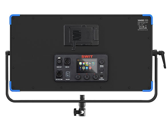 VANGO-100 rear control panel supports 5-pin DMX in & out, 4-pin XLR DC 11-36V in, and V-mount battery plate (Gold mount for option), and a large color LCD with menu and hot keys for convenient color picking.