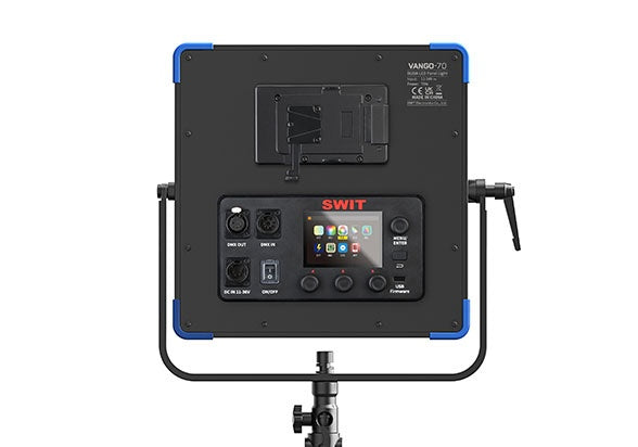 VANGO-70 rear control panel supports 5-pin DMX in & out, 4-pin XLR DC 11-36V in, and V-mount battery plate (Gold mount for option), and a large color LCD with menu and hot keys for convenient color picking.