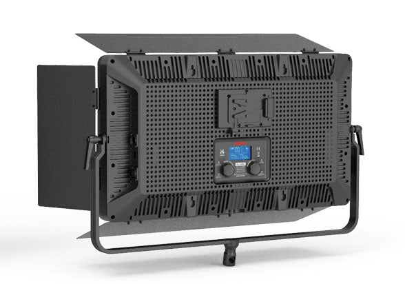 The rear LCD screen can display the current dimmer percentage, color temperature value, DMX channel and CH channel, and remaining battery indications.