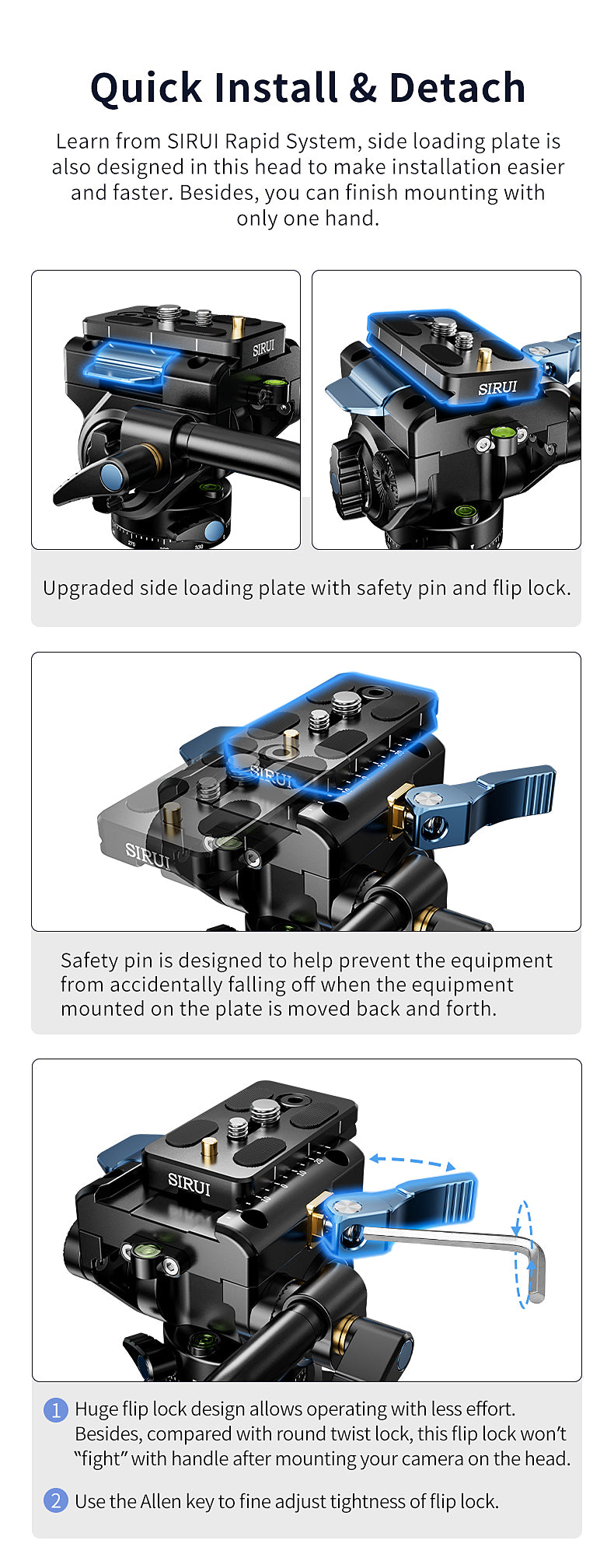Hurtig installation og afmonteringMed udgangspunkt i SIRUI Rapid System er der også designet en sideplade i dette hoved for at gøre installationen nemmere og hurtigere. Desuden kan du afslutte monteringen med kun én hånd.