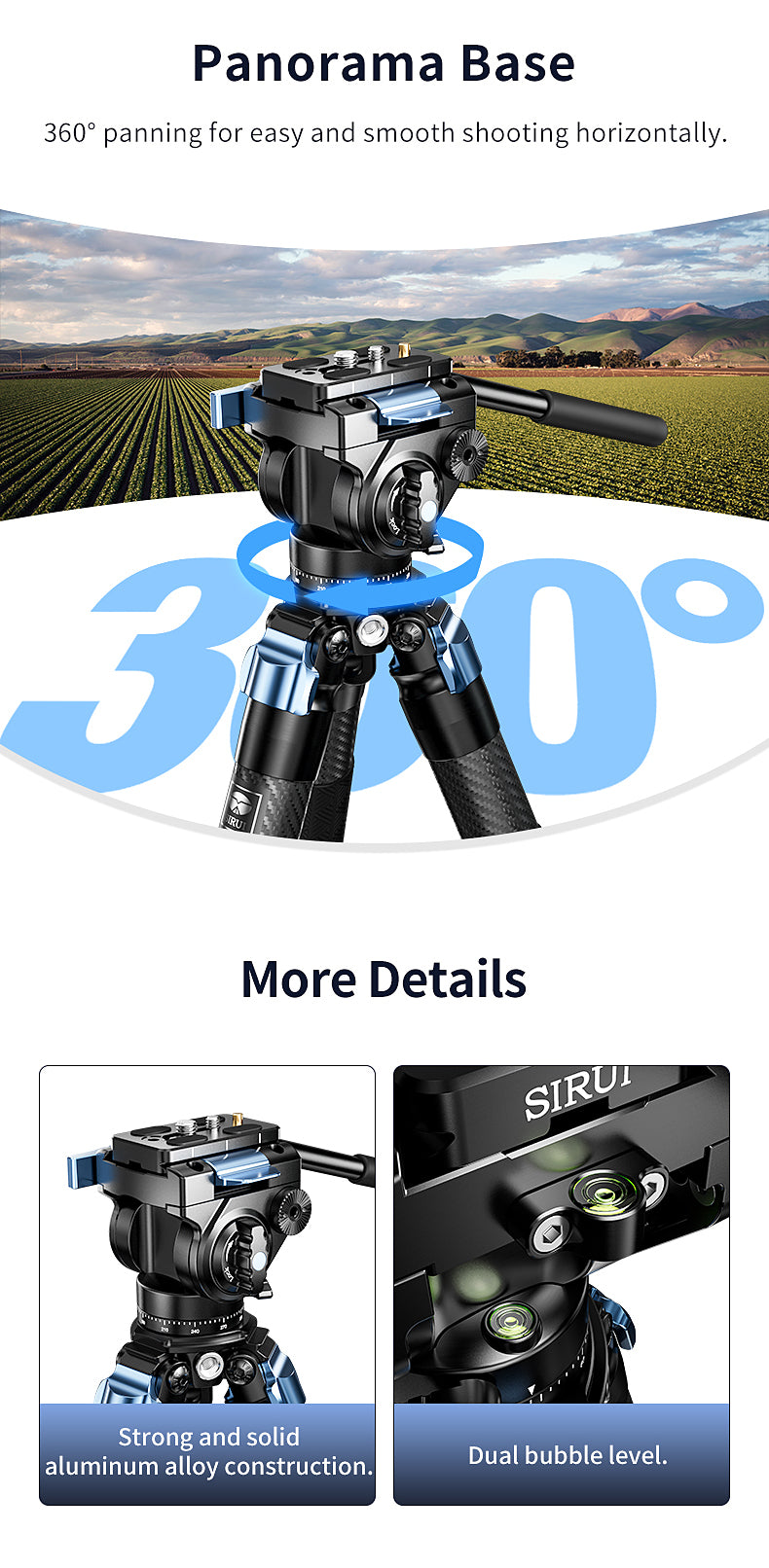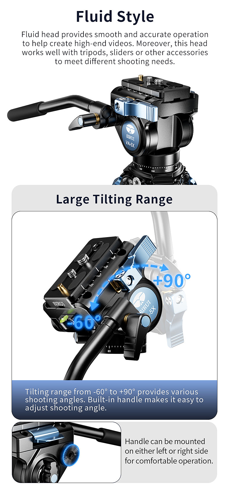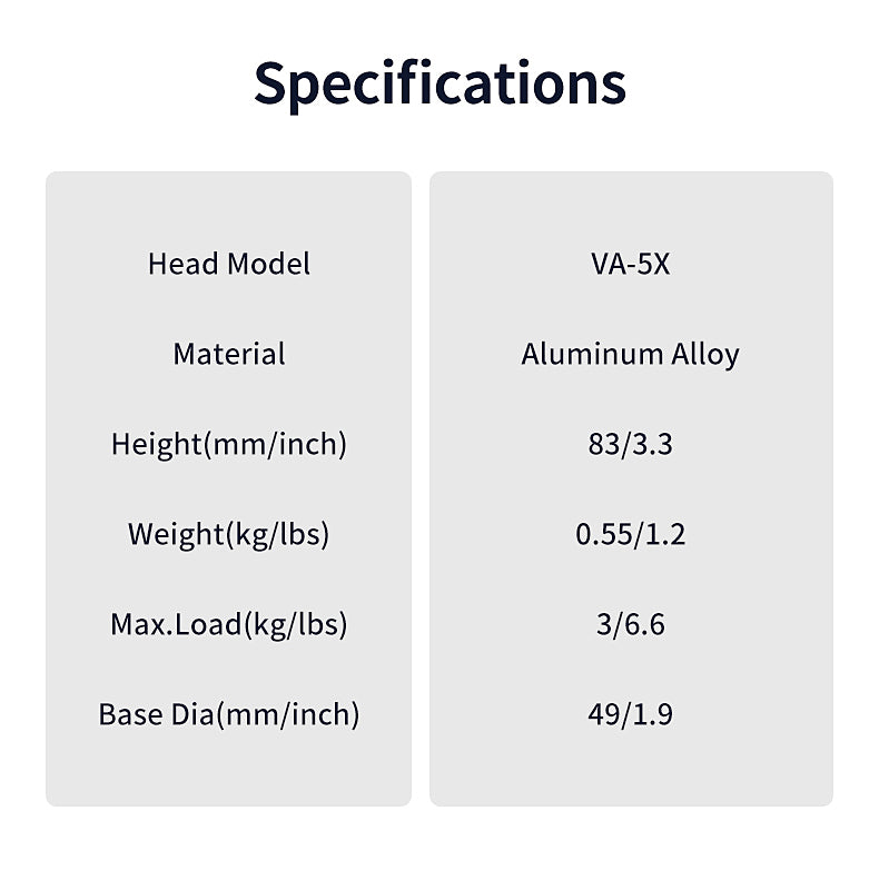 Va-5X er perfekt til brug med kompakte DSLR'er og videokameraer, der vejer op til 3 kg. Den inkluderer en TY-70A Quick Release Plate og accepterer SIRUI TY-plader med Arca-Swiss-standard