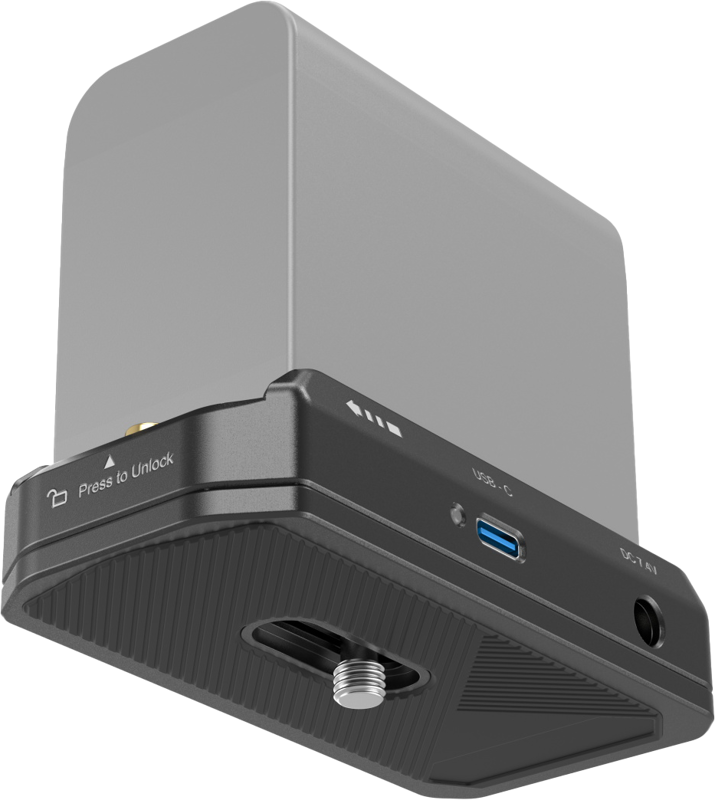Der er 36W 7,4V / 12V DC-udgang på siderne og en 36W USB-C-port, som kan afgive strøm eller oplade et NP-F-batteri.
